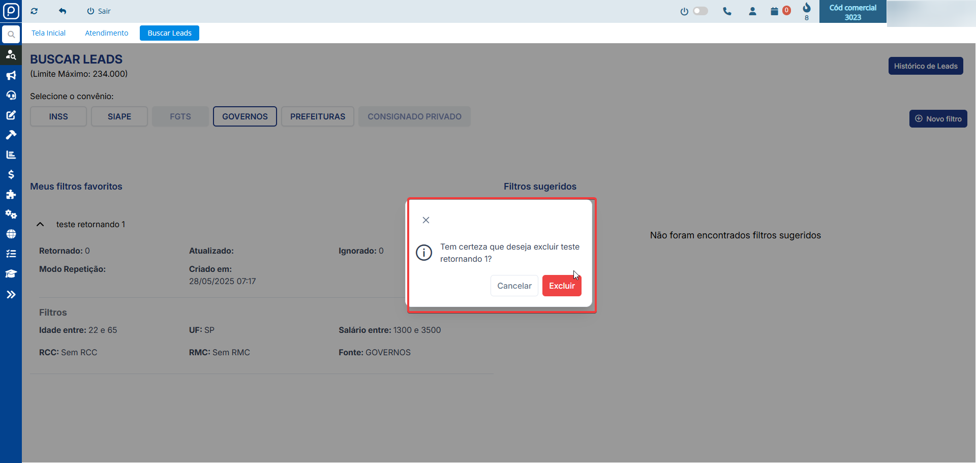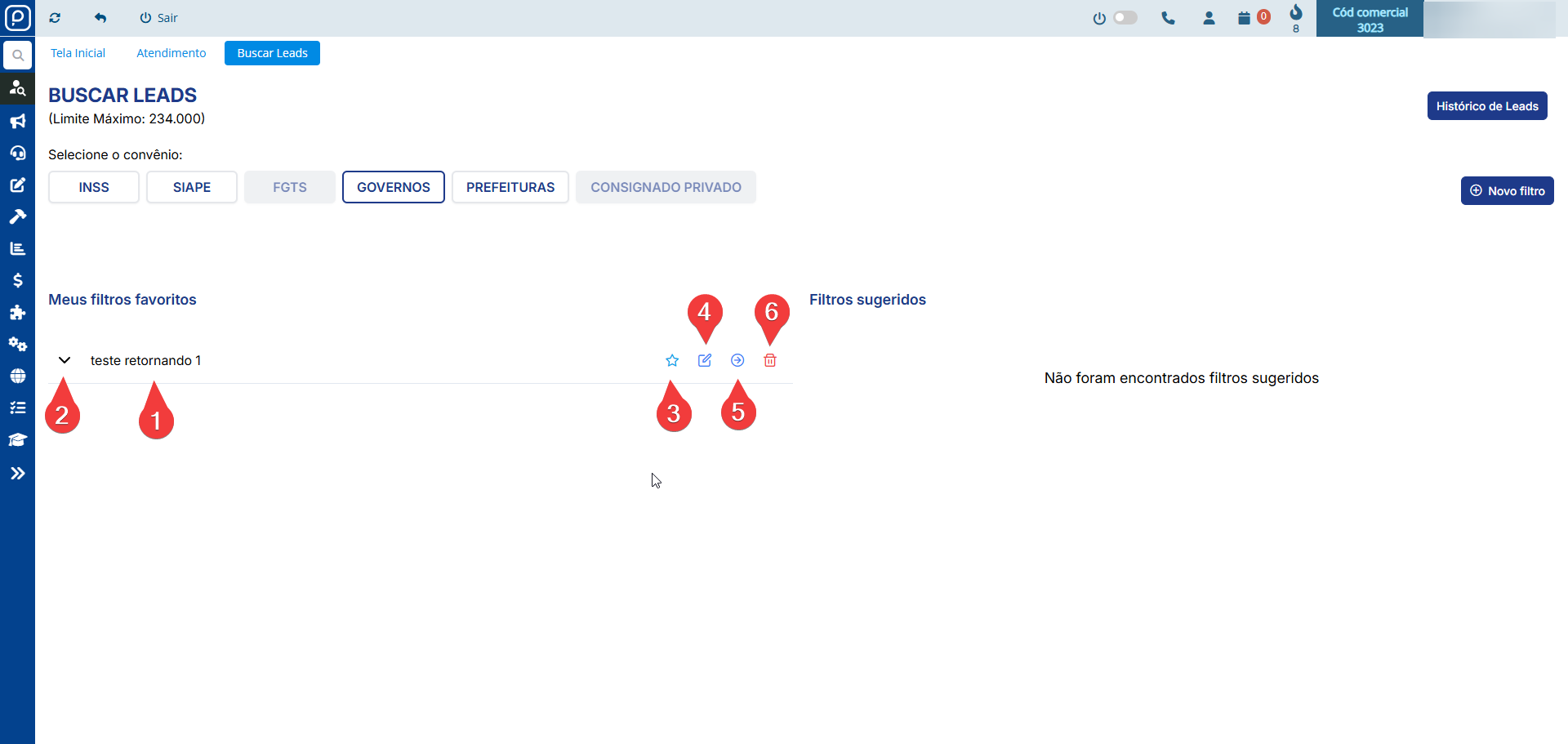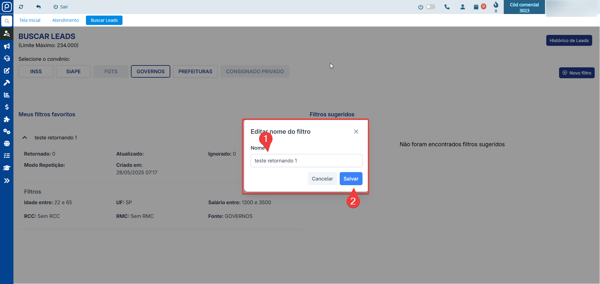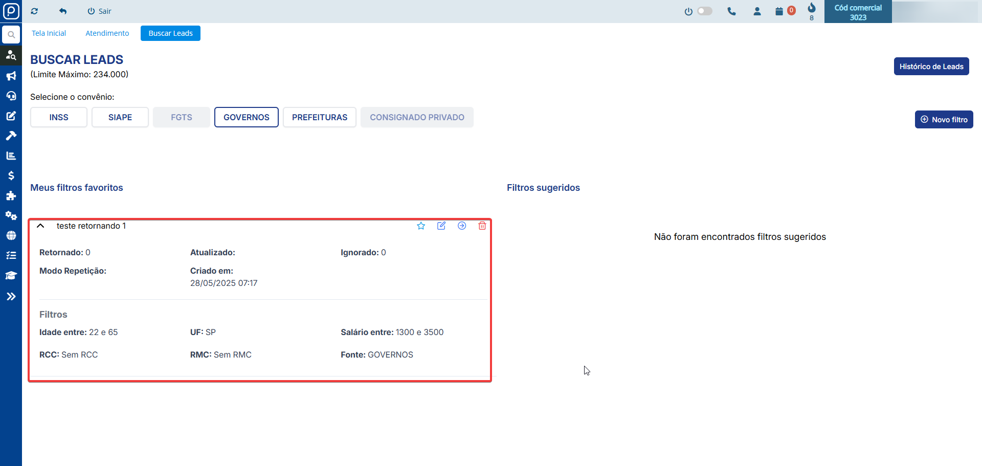 A funcionalidade Buscar Leads (anteriormente “Gerar Leads”) representa uma evolução significativa na forma como você identifica, filtra e seleciona clientes potenciais para suas campanhas de crédito consignado. Com uma interface modernizada e recursos aprimorados, o sistema agora oferece maior agilidade na segmentação de público e na aplicação de filtros personalizados, permitindo que gestores e operadores tomem decisões mais estratégicas e assertivas na construção de suas bases de atendimento.