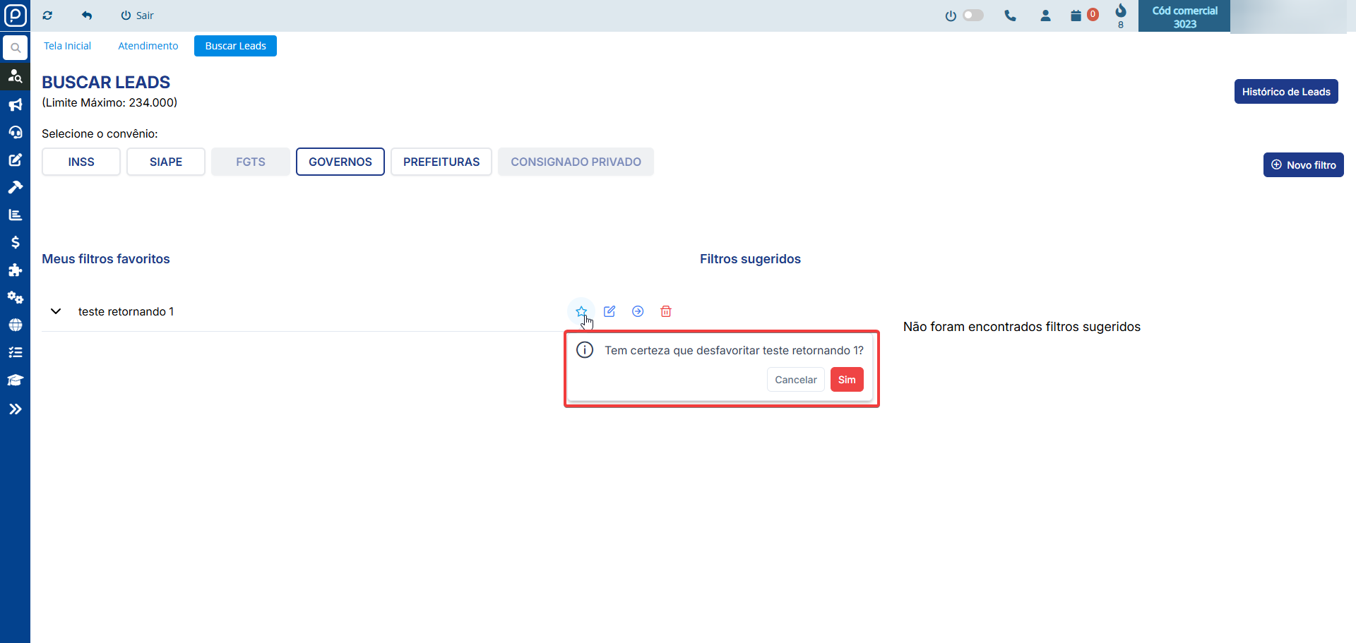 Importante: Remover um filtro dos favoritos não exclui o modelo permanentemente. O filtro permanece disponível no sistema e pode ser marcado como favorito novamente no futuro.