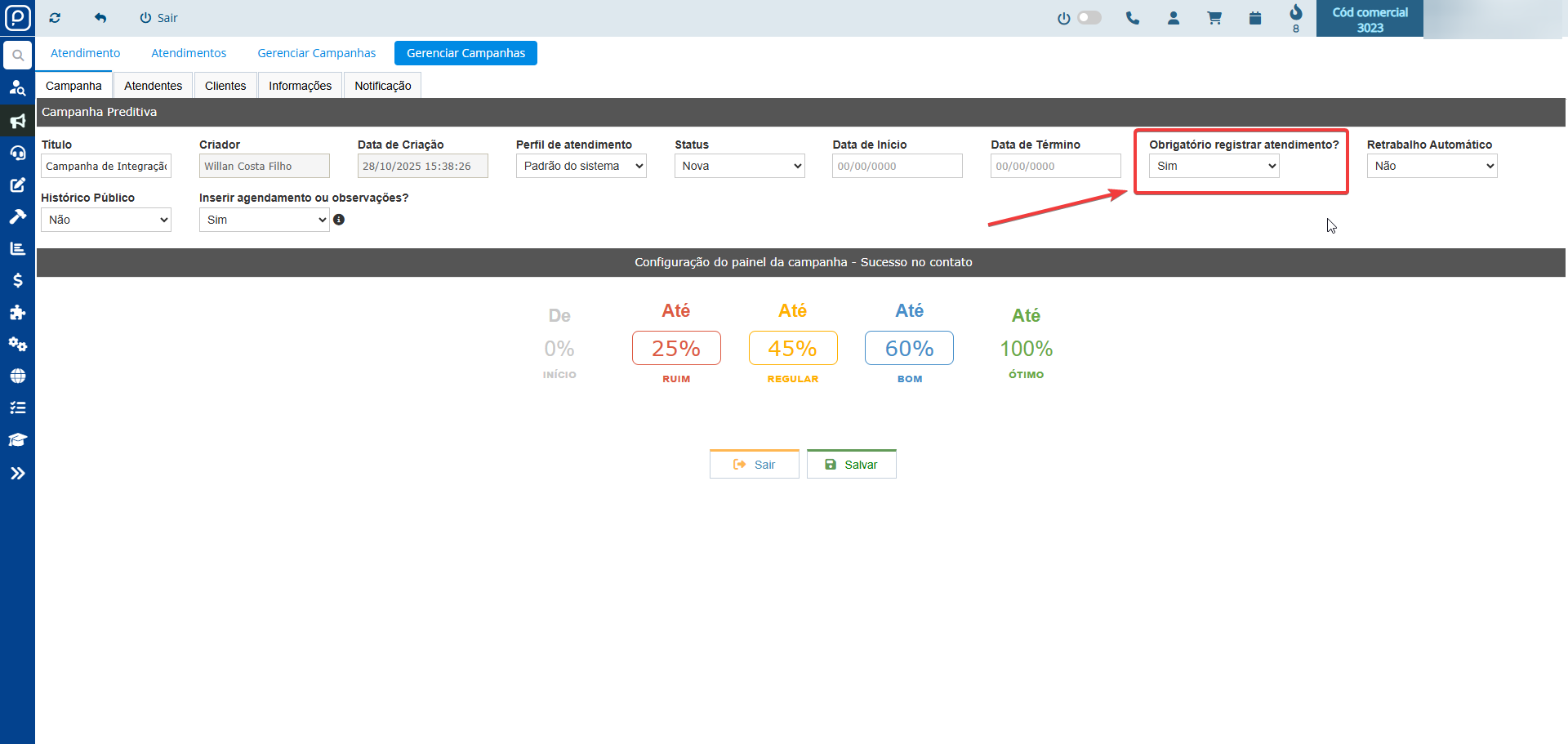 Como uma forma de melhorar ainda mais a experiência de registro de atendimento no PromoBank, nós disponibilizamos uma nova opção de configuração dentro do painel de criação e edição da campanha preditiva no sistema.